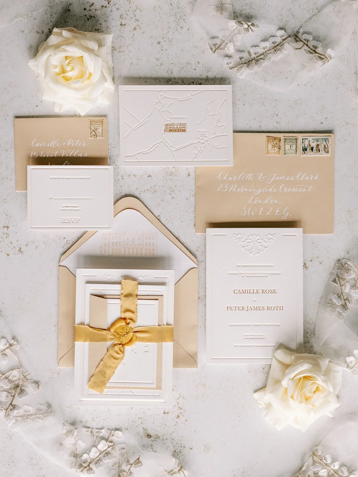 The bespoke stationery was a tactile delight of letterpress, embossing and shimmering gold foil, in a neutral palette reminiscent of the elegant Prestwold Hall stonework. The invitation suite featured an envelope liner with a stunning illustration of the venue, ultra-thick pure cotton letterpress cardstock, and gorgeous gold accents, bound together with gold silk ribbon and an elegant wax seal. The envelopes are adorned with bespoke calligraphy, adding a touch of romance to the suite.