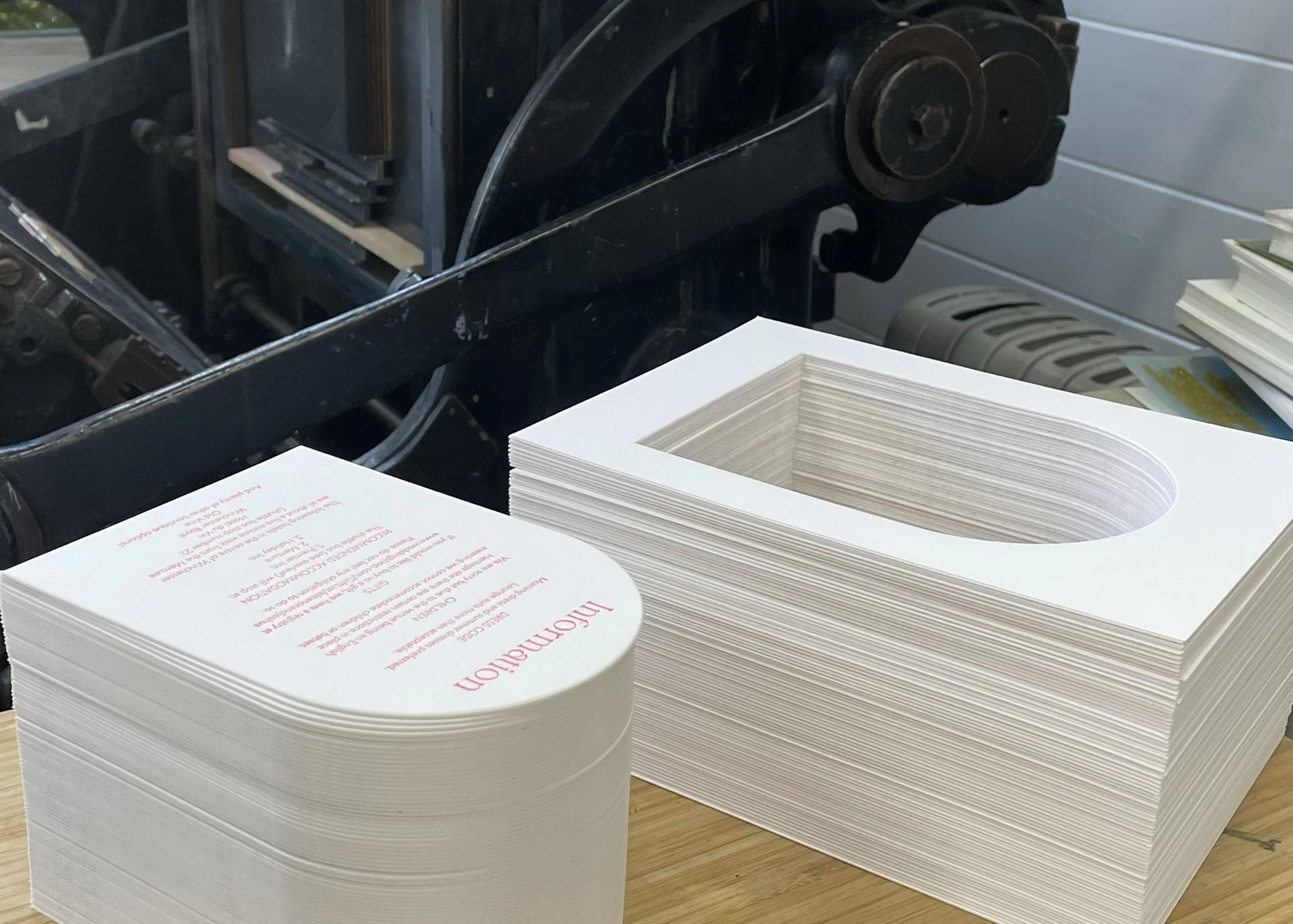 Because letterpress printing uses physical plates rather than digital files, each colour is printed separately. This means that designs with multiple colours must be carefully planned so that elements align perfectly in the final print. It’s a little bit like designing a jigsaw puzzle you’ll be printing in layers – and it’s weirdly satisfying.