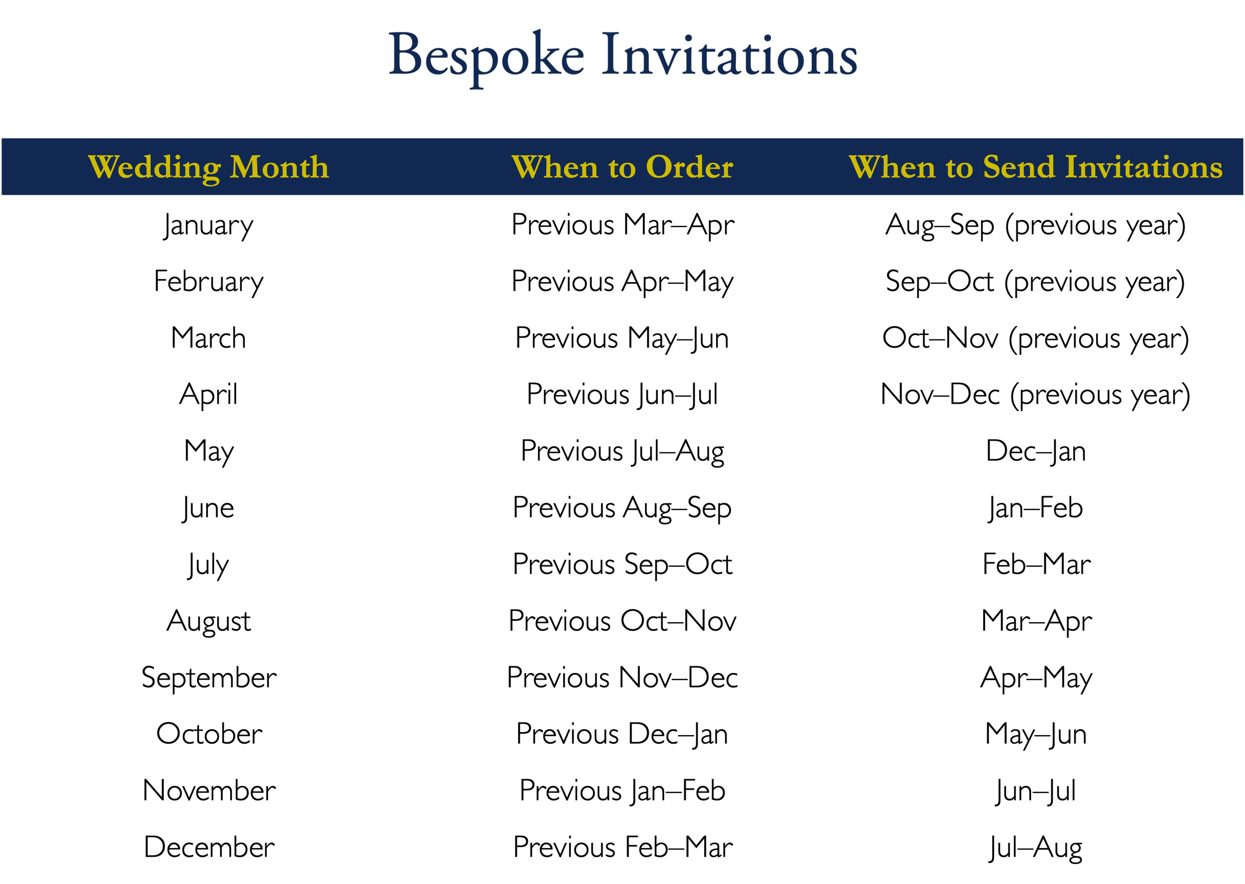 Bespoke suites – order around 9–12 months before your wedding, send invitations 4–6 months before.